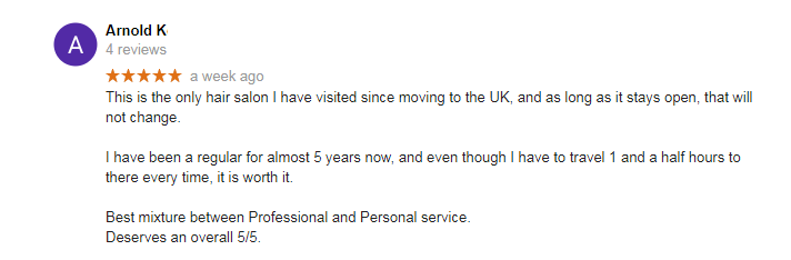 This is the only hair salon I have visited since moving to the UK, and as long as it stays open, that will not change. I have been a regular for almost 5 years now, and even though I have to travel 1 and a half hours to there every time, it is worth it. Best mixture between Professional and Personal service.