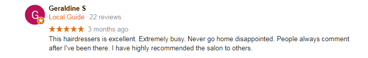 This hairdressers is excellent. Extremely busy. Never go home disappointed. People always comment after I’ve been there. I have highly recommended the salon to others.